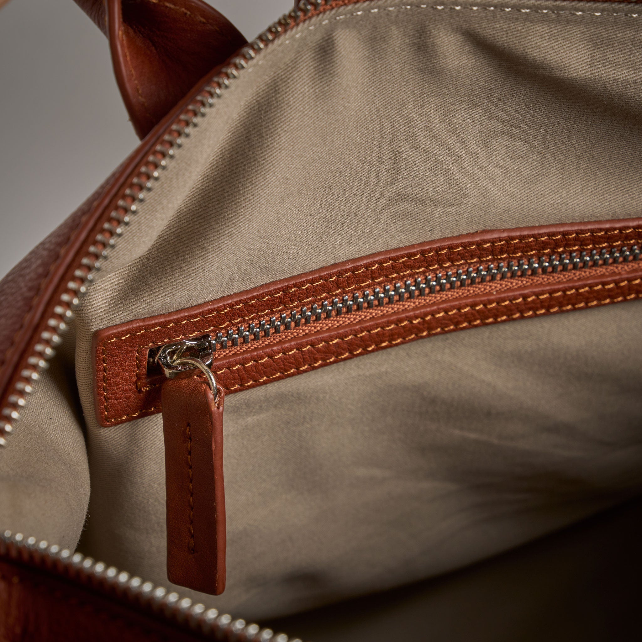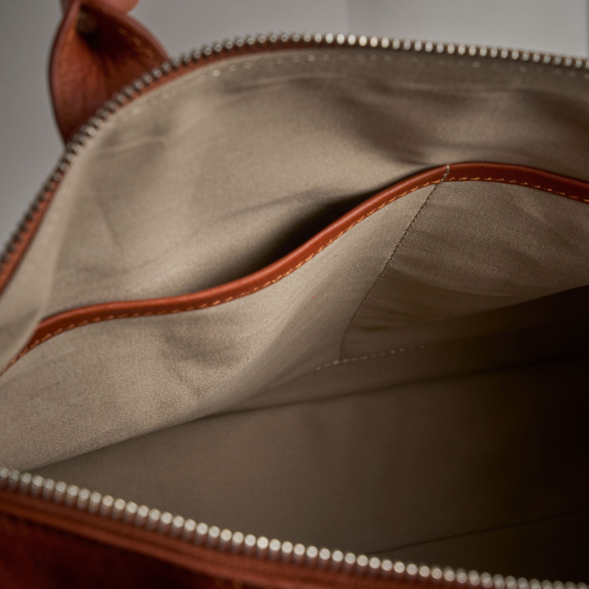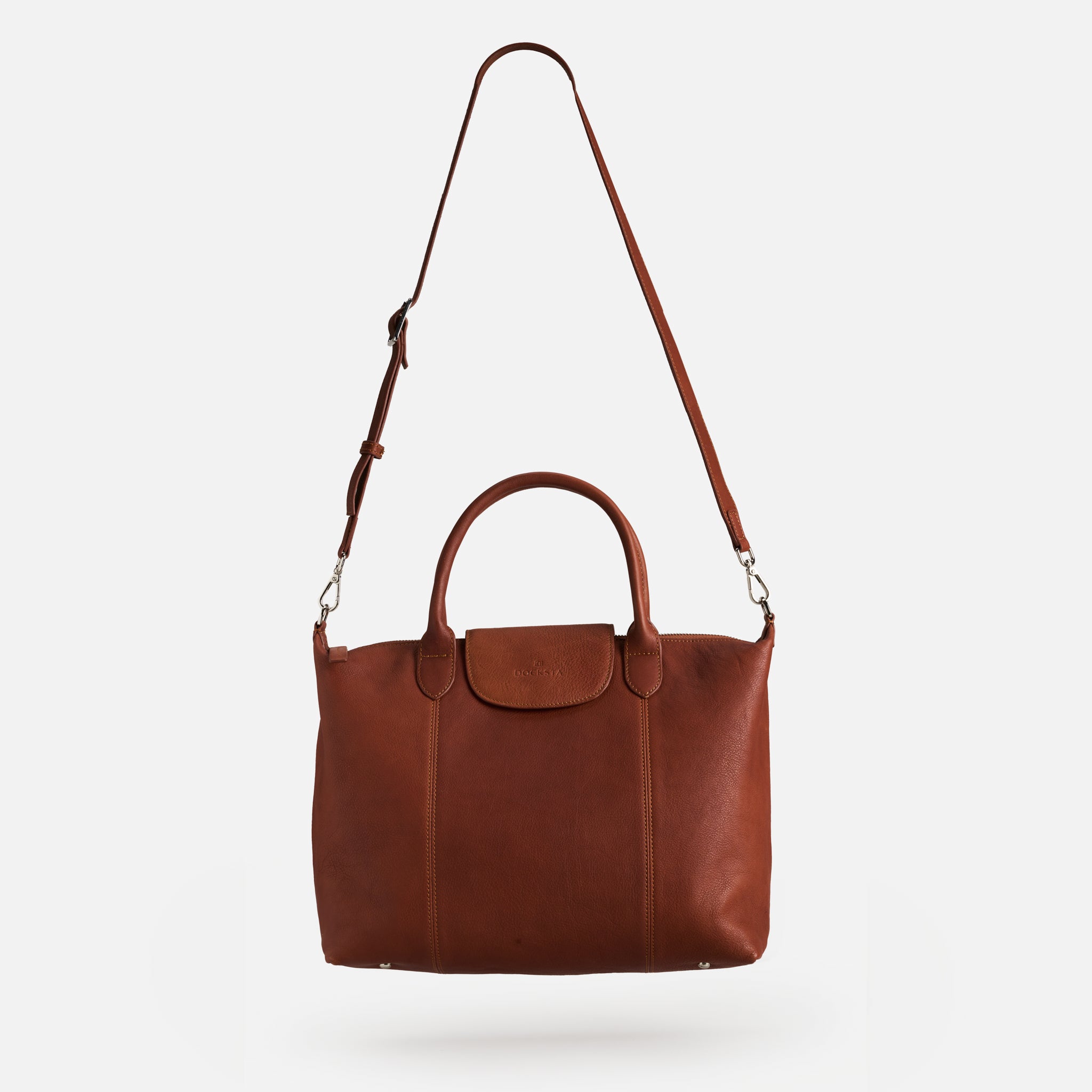 Handbag in brown vegetable tanned leather that will be passed down for generations. The bag holds a laptop and has a zippered pocket and two compartments that make it easy to organize your things. All zippers are from the YKK Excella brand, which stands for high quality. Adjustable shoulder strap and a stable bottom with round feet that makes it stand firmly without falling. The bag comes with a dustbag that protects your bag when you are not using it. Size: 40x28x16 cm