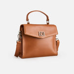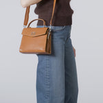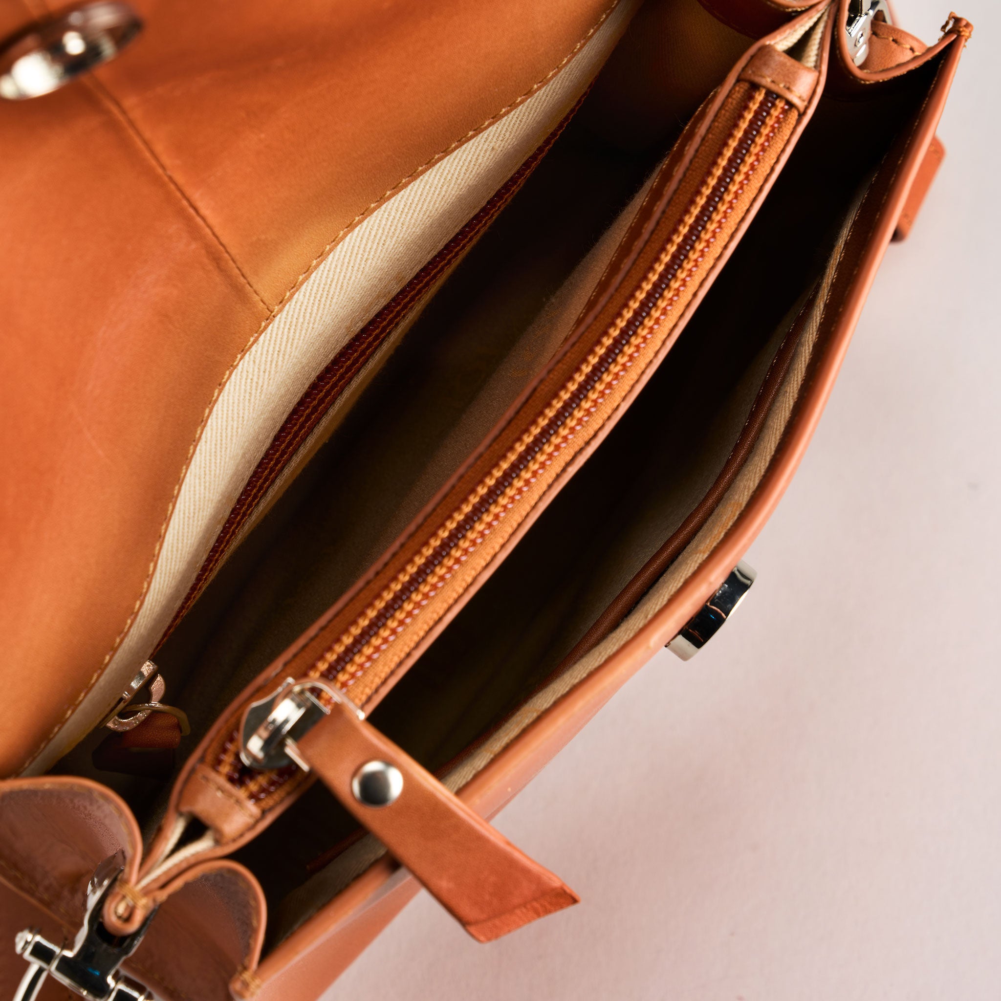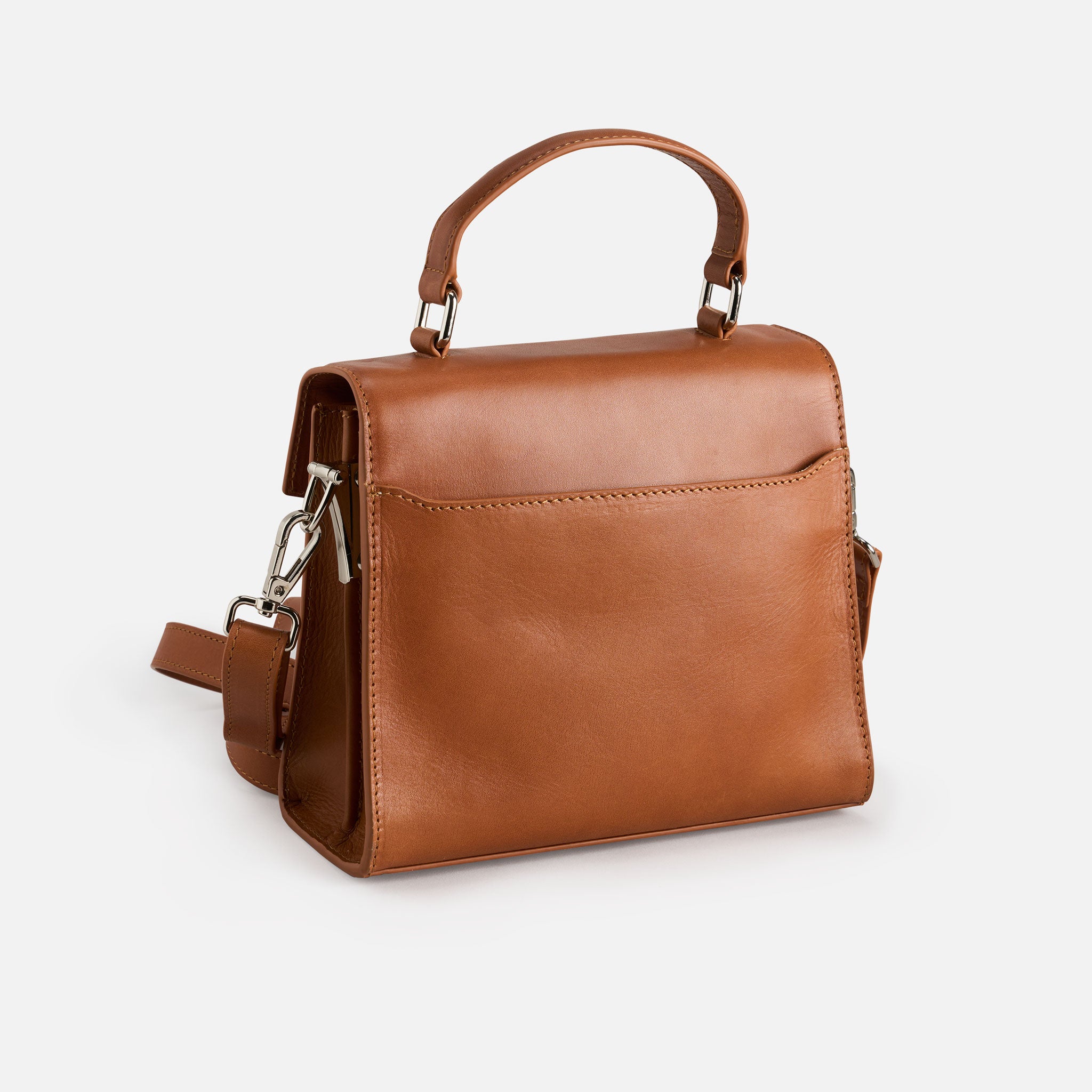 Handbag in natural vegetable tanned leather. The bag holds a mobile phone and wallet. Adjustable shoulder strap. Dimensions: 20 x 17 x 8 cm