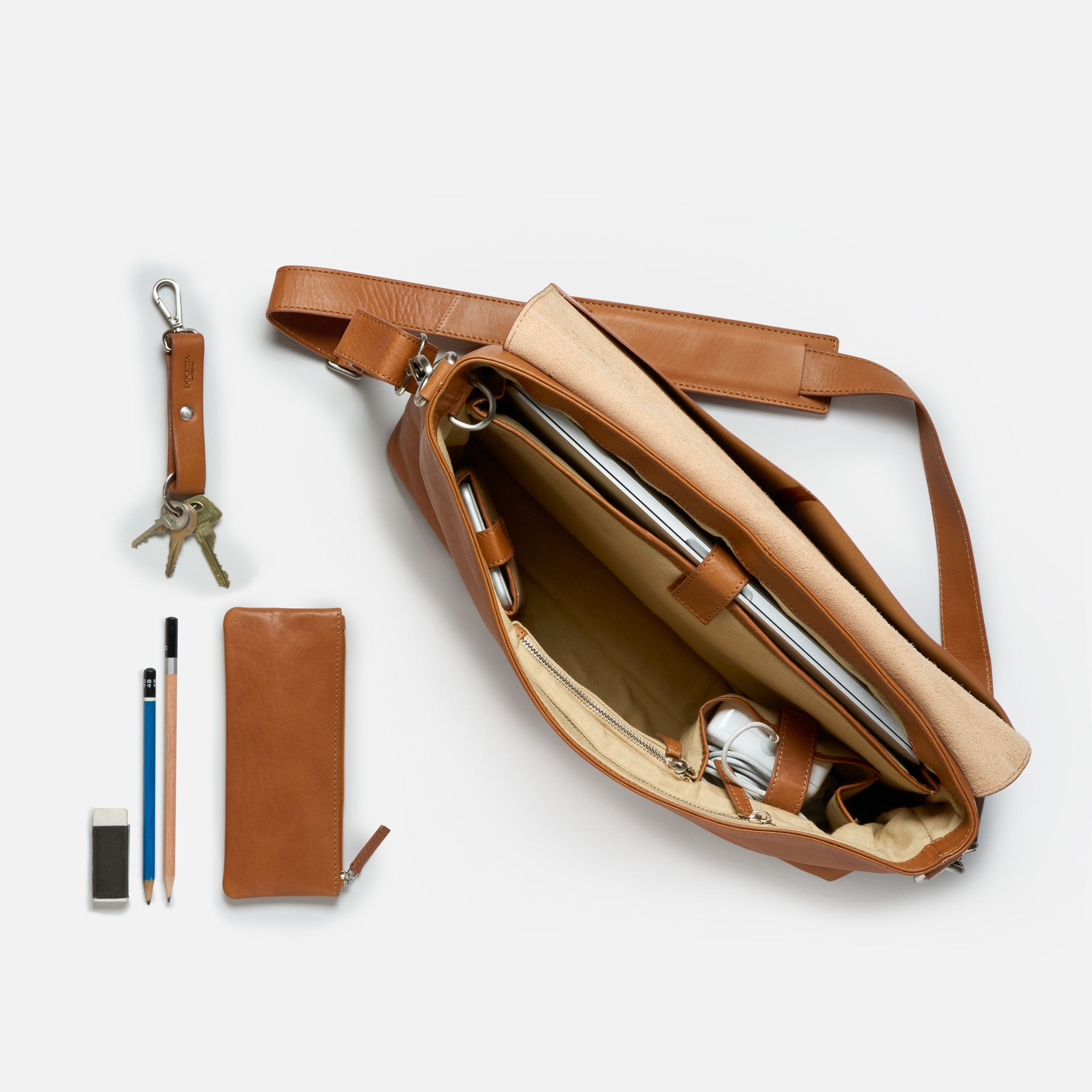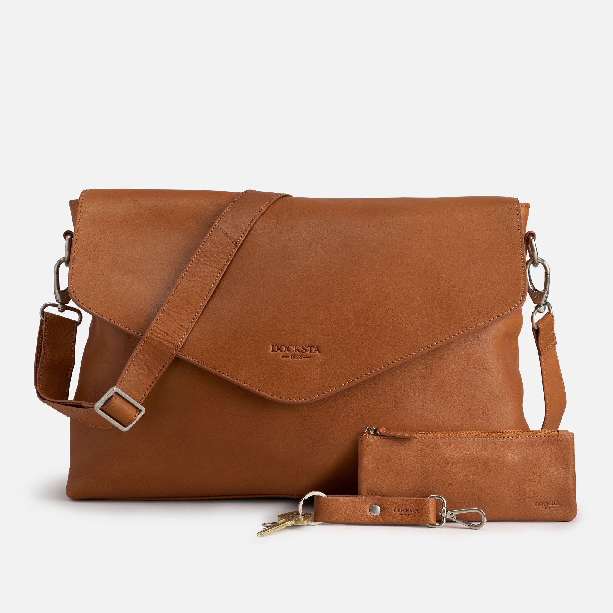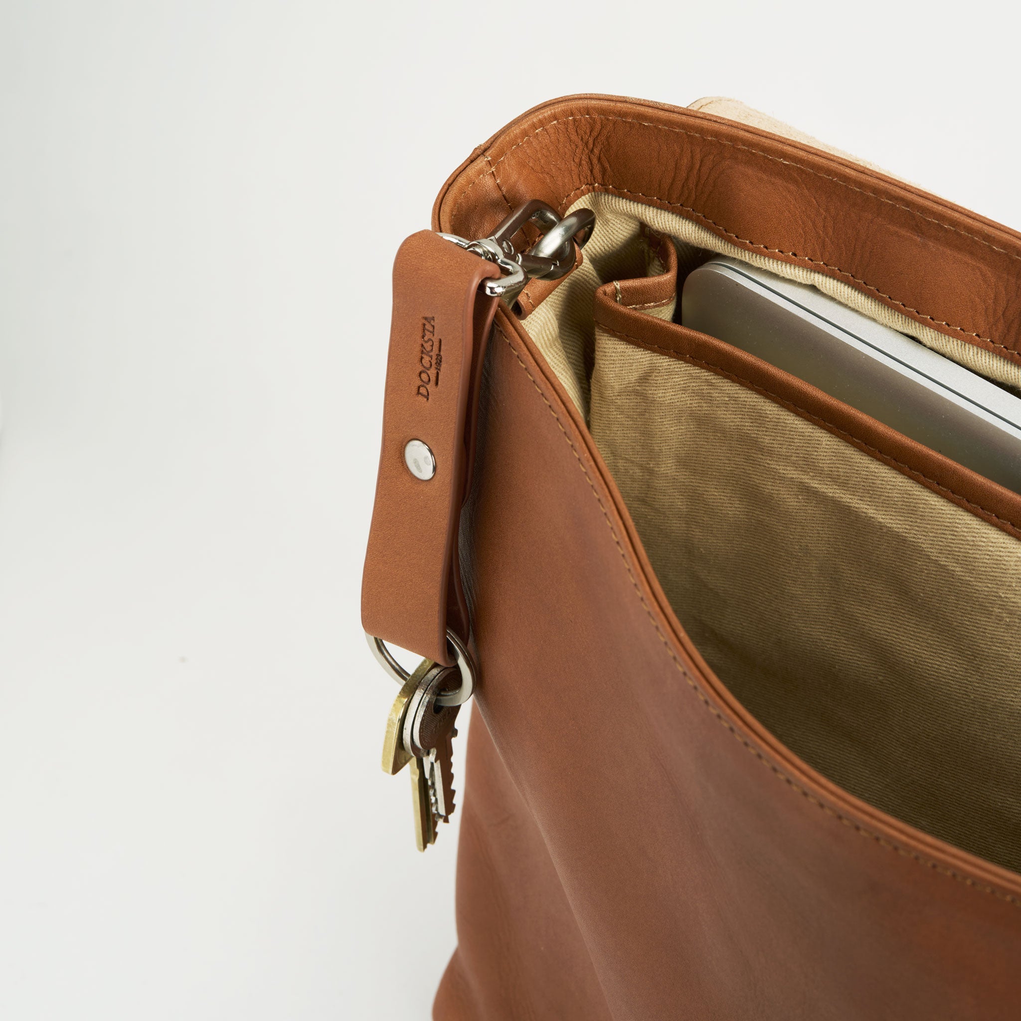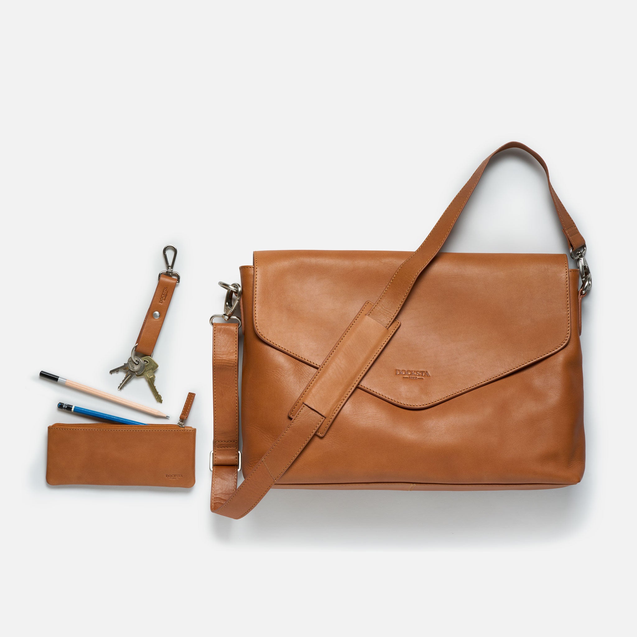 Docksta Mika laptop bag is a functional bag designed to protect your computer and structure your digital everyday life. The computer bag easily holds a 15 inch computer and has several compartments for charger, mouse, notepad, glasses case and mobile phone. It also comes with a stylish pen case in the same leather to keep pens and small items organized. The keychain that comes with the bag can be hooked to a ring inside the bag to quickly find your keys.