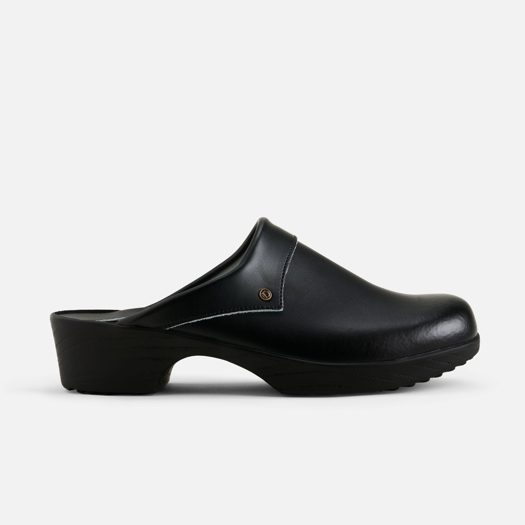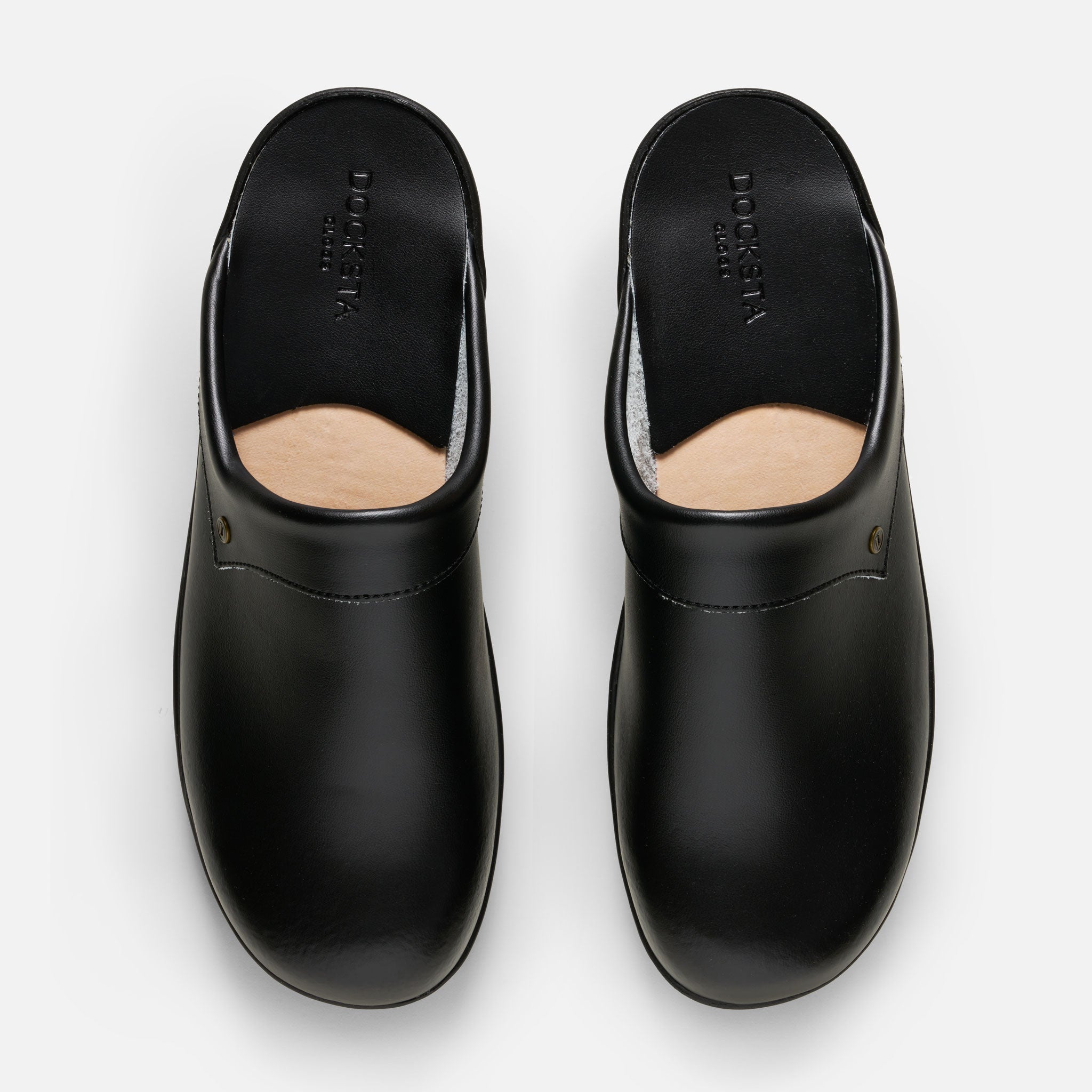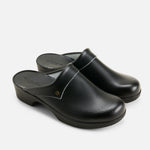 Comfortable men's clogs with a soft rubber sole that is supportive. Good for long workdays when you walk and stand a lot. The black leather upper molds nicely to the foot.