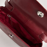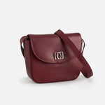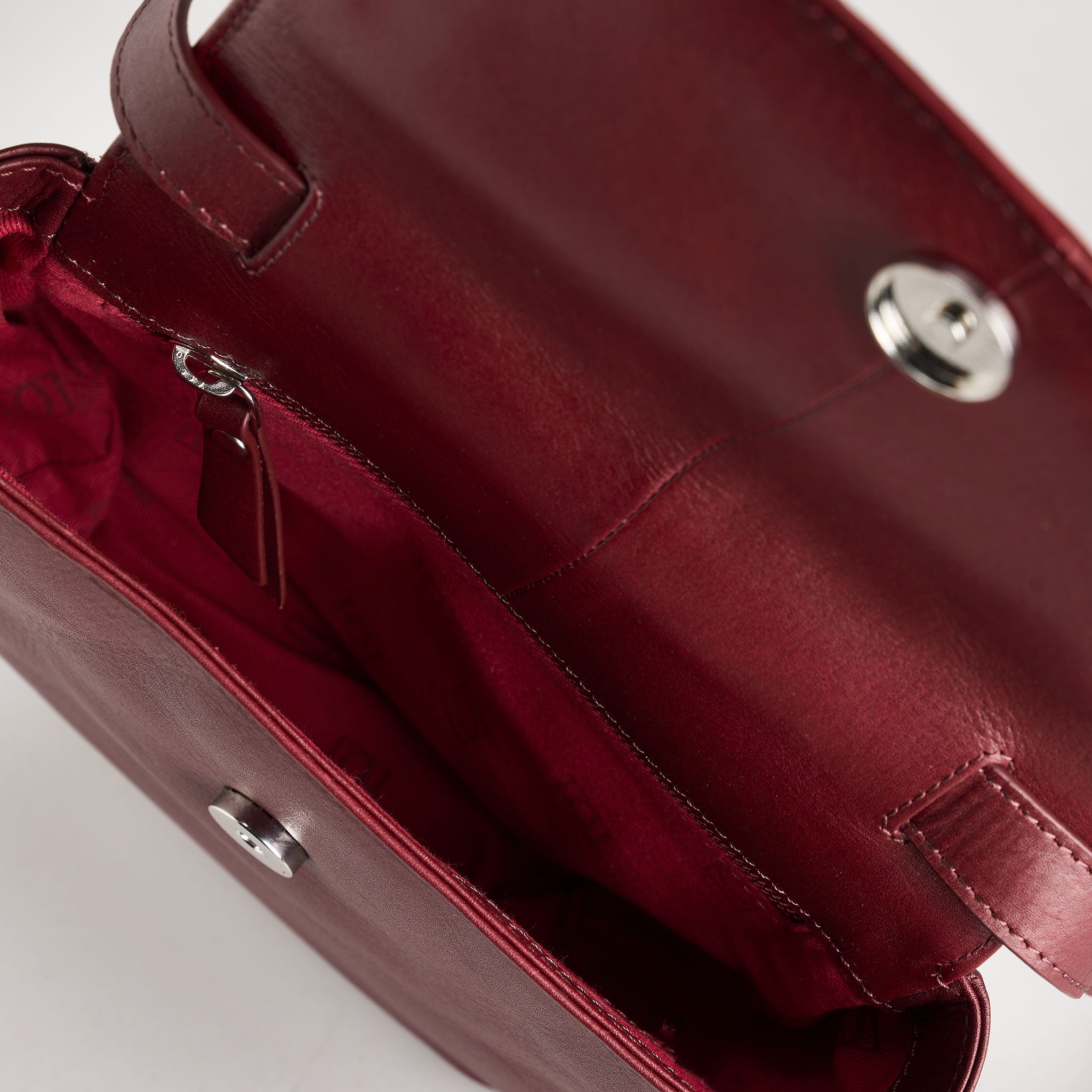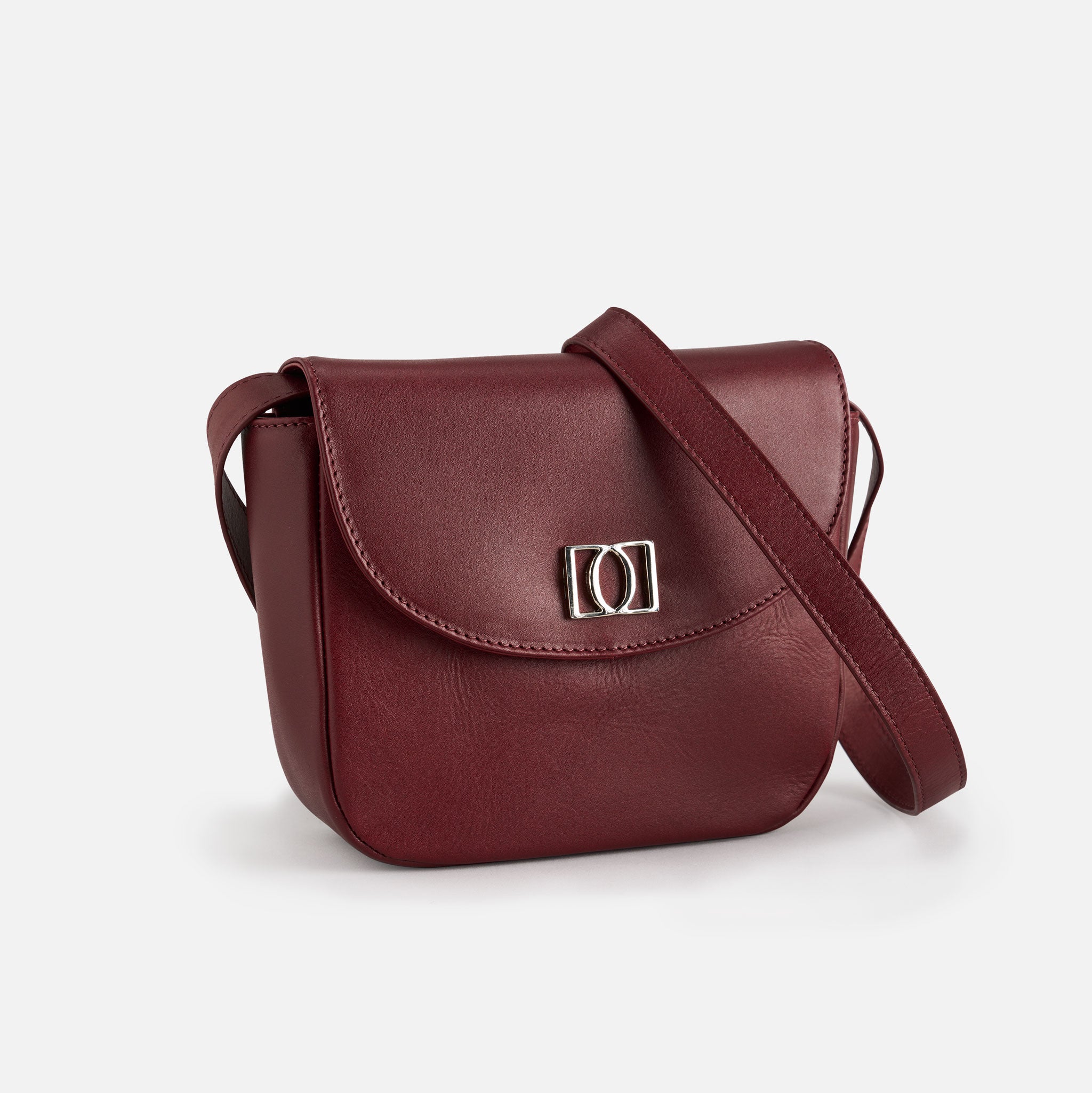 Shoulder bag in burgundy vegetable tanned leather in a beautiful round shape. The bag holds a mobile phone and wallet. Adjustable shoulder strap. Dimensions: 21x17x6 cm