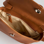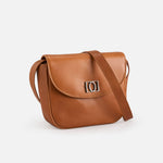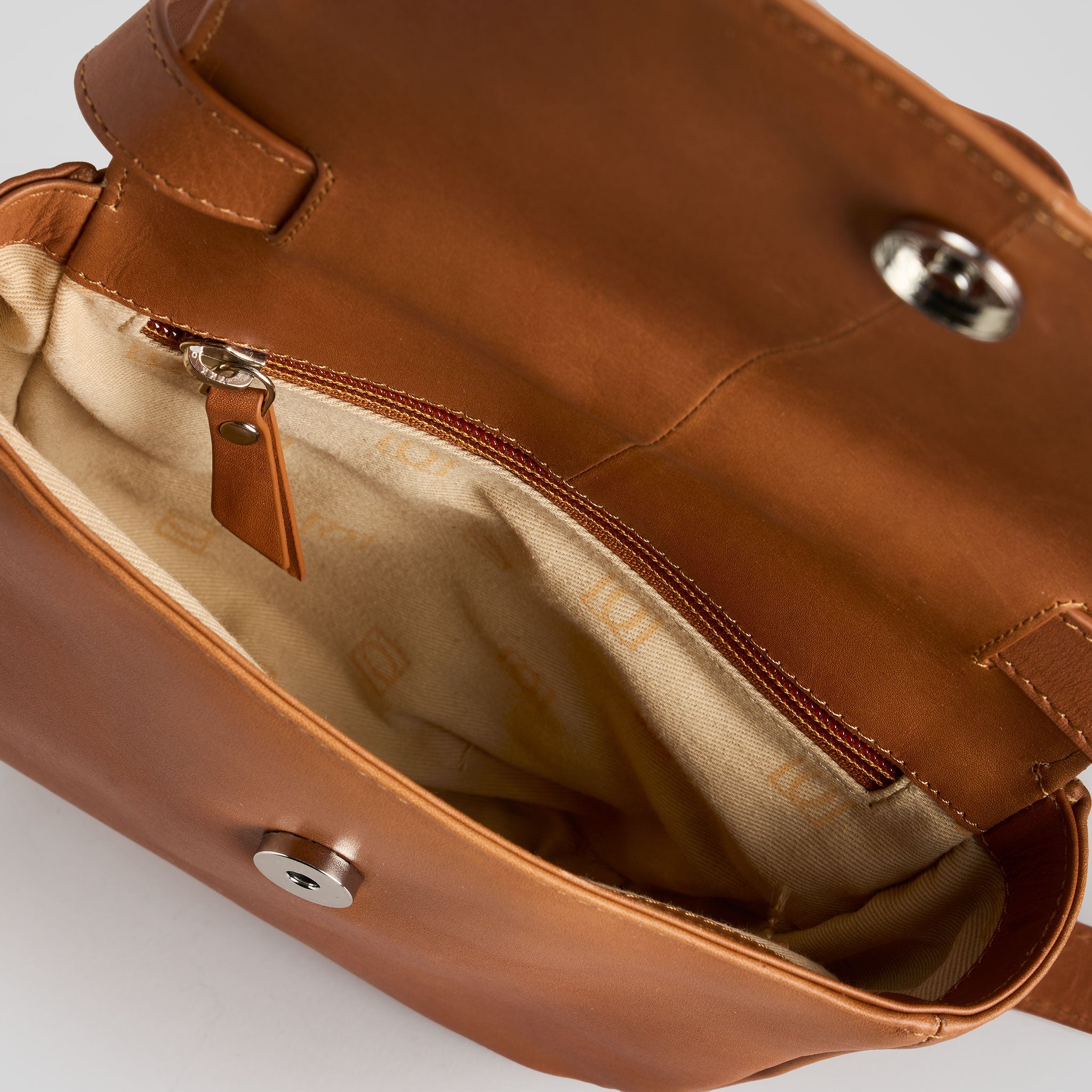 Shoulder bag in natural vegetable tanned leather in a beautiful round shape. The bag holds a mobile phone and wallet. Adjustable shoulder strap. Dimensions: 21x17x6 cm