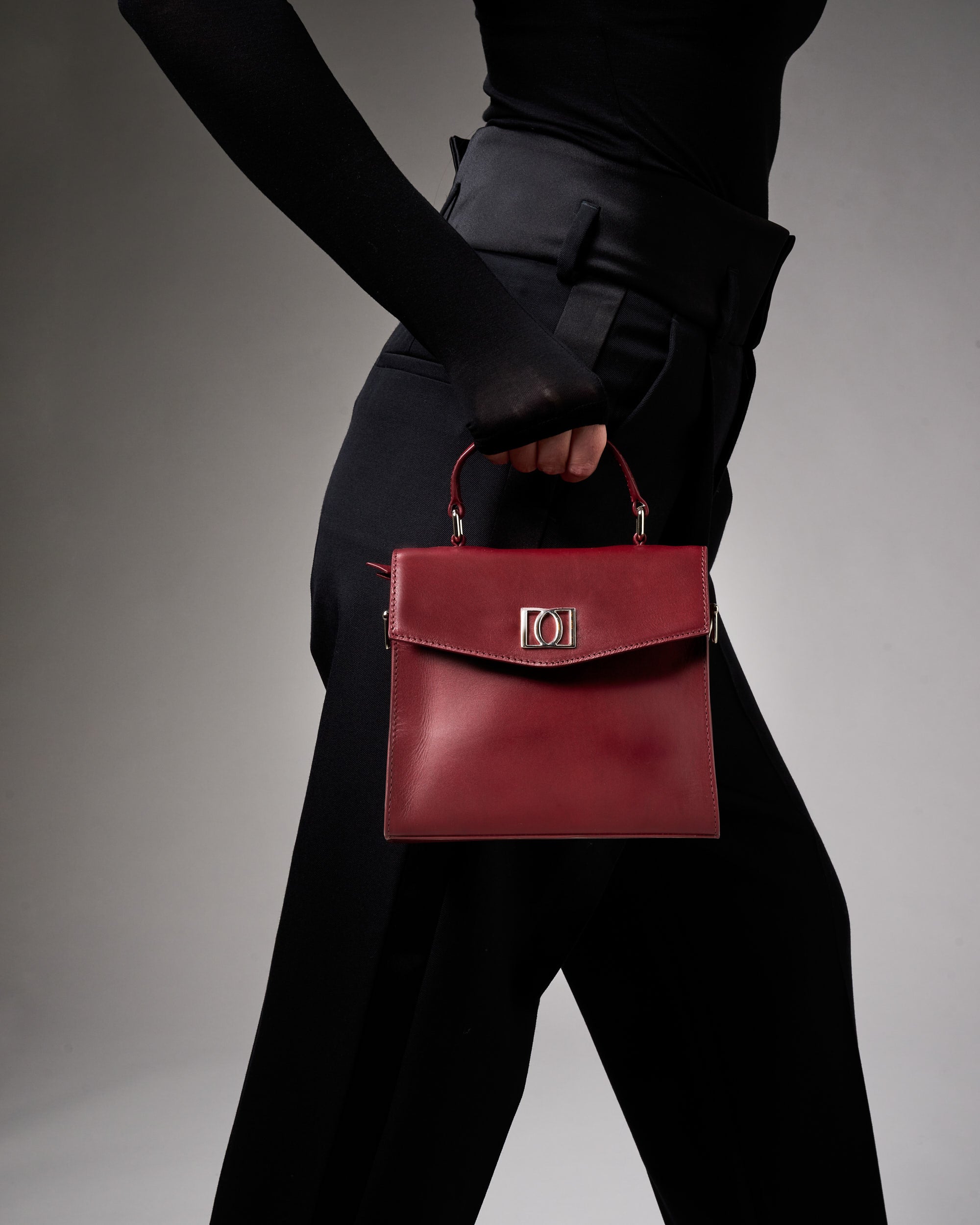 Handbag in burgundy vegetable tanned leather. The bag holds a mobile phone and wallet. Adjustable shoulder strap. Dimensions: 20 x 17 x 8 cm